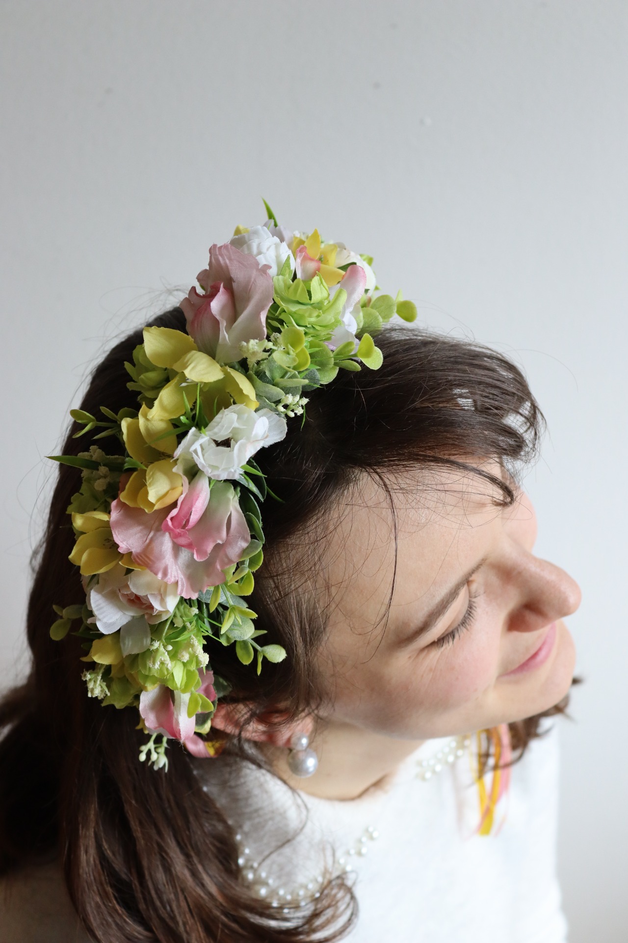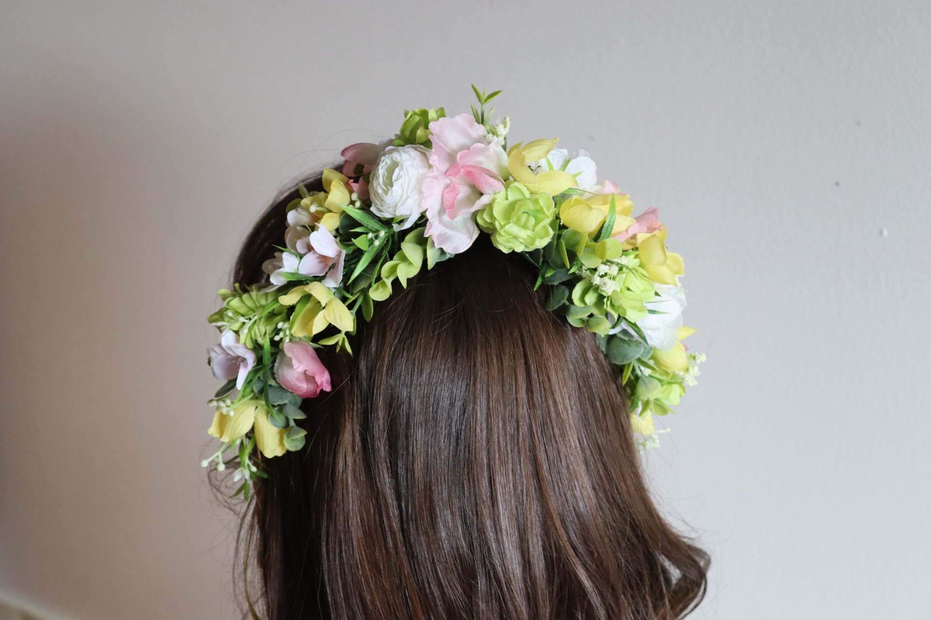 Věneček do vlasů z umělých květů - růžová poupata, žlutý zvonek a svěží zeleň.